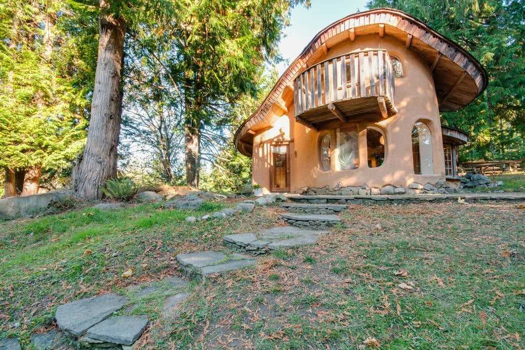 Домик округлой формы, отделанный черепицей, имеет стеклянную стену. Он подойдет для сезонного проживания, станет отличным решением для дачи.