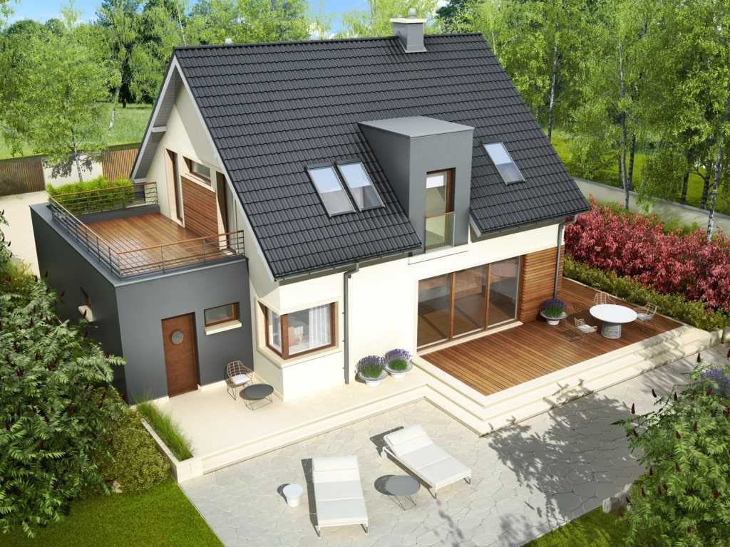Типичный проект двускатного дома с мансардой и летней площадкой. Выполнен в стиле кантри.