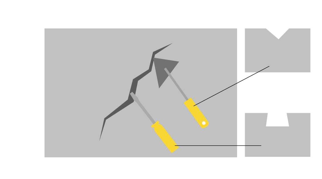 - Трещину расшивают с помощью отвертки или треугольного шпателя.