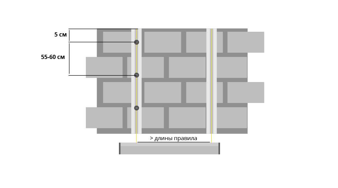 На следующем этапе нужно выставить маяки. Их можно устанавливать на раствор или на саморезы. Расстояние между маяками должно соответствовать длине правила.