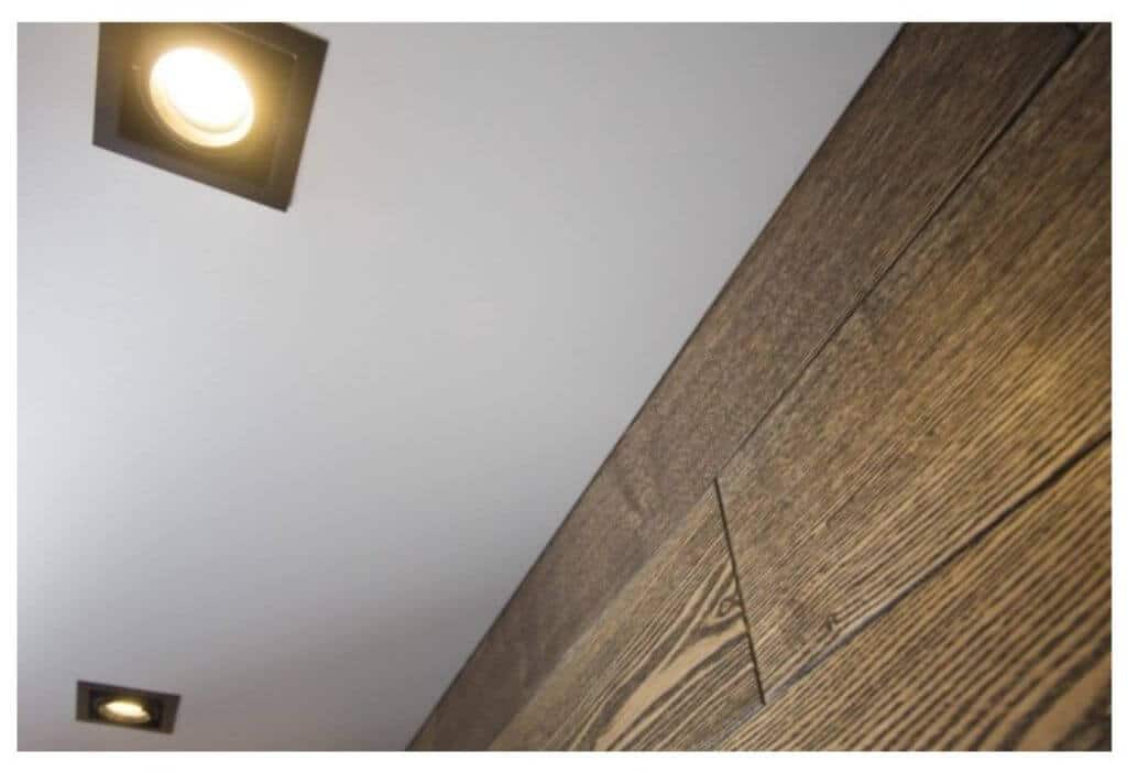 В зависимости от используемого багета и особенностей монтажа пленки крепежный профиль может быть частично видимым или полностью скрытым в пазу за натяжным потолком. Небольшую щель между покрытием и стеной закрывают потолочным плинтусом или декоративной вставкой.