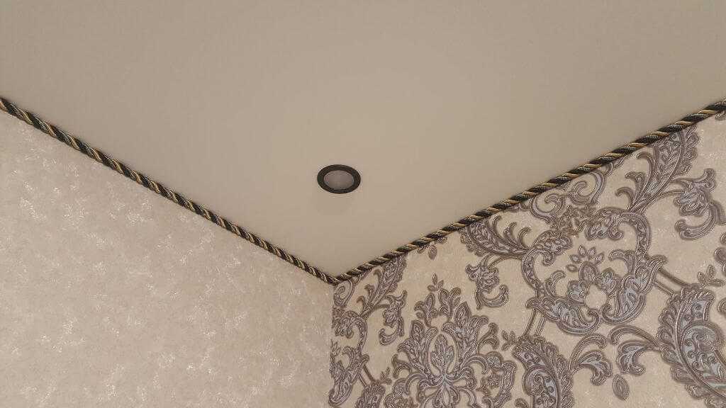 - Без клея. Кантик просто вставляется в зазор между натяжным потолком и стеной. Плюс этого способа в том, что при такой установке можно легко вытащить и вставить кант обратно. Минус — что этот вариант подходит только для окантовочных шнуров определенной толщины. Слишком толстый, либо наоборот чрезмерно узкий кант вставить в профиль не получится. Дополнительно края шнура можно обработать космофеном, чтобы они меньше растрепывались.