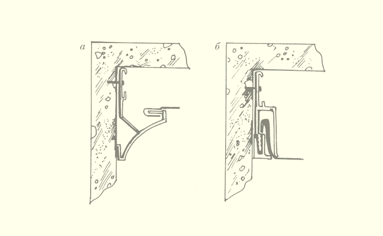 невидимые – багет, закрывающийся тканью или ПВХ пленкой. Эту конструкцию тоже можно спрятать под декоративным плинтусом, который одной стороной клеится к стене