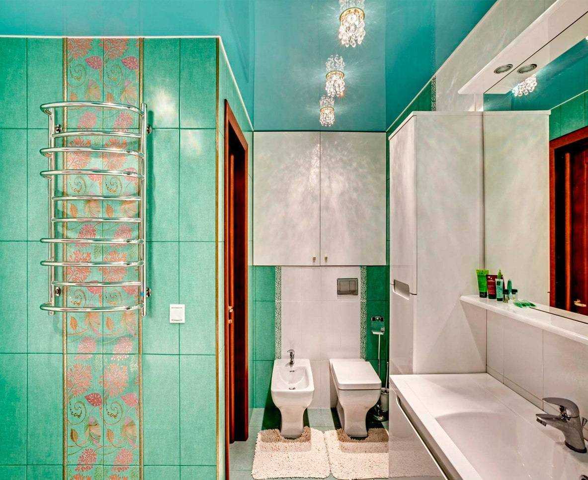 На фото люстра для натяжного потолка в интерьере ванной комнаты.