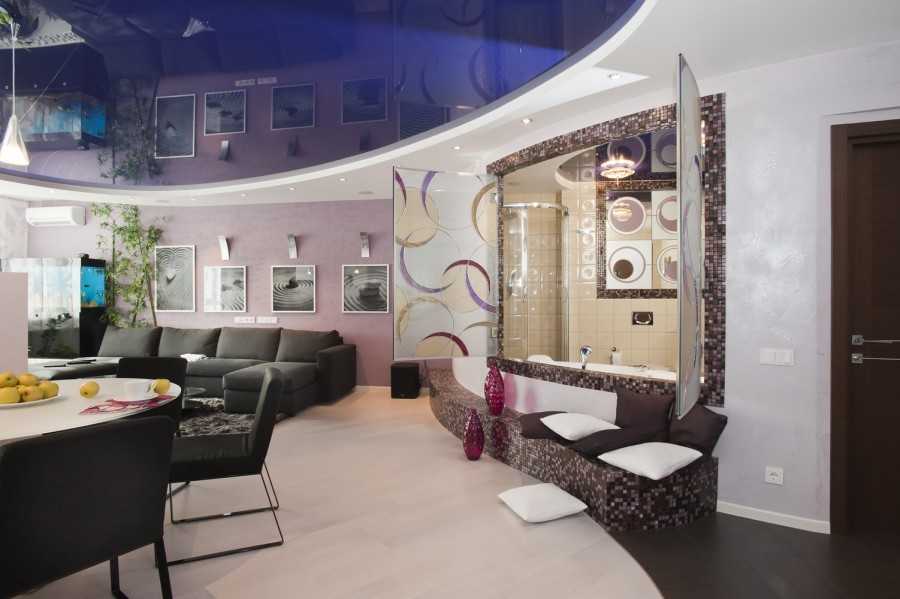 Широкая комната с низкими потолками становится визуально вдвое выше, если использовать при ее отделке глянцевое потолочное полотно.