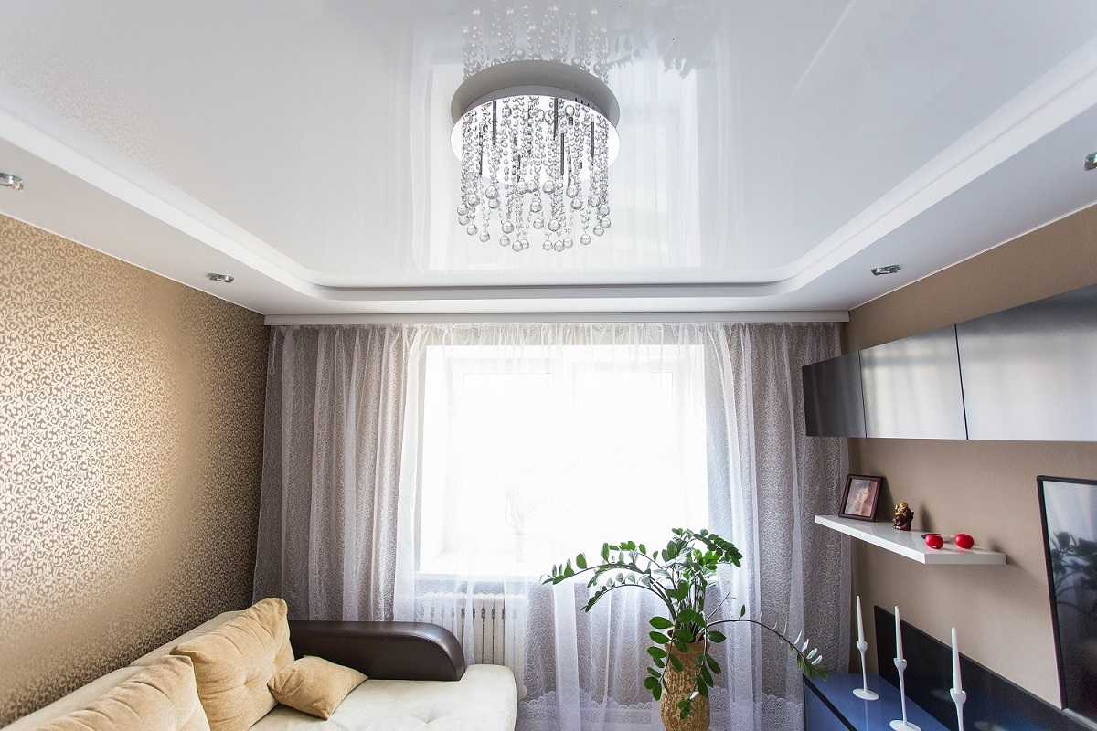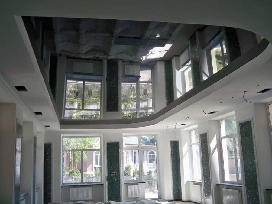 Глянцевый потолок бывает двухуровневым или многоуровневым. Создание уровней будет оптимальным решением для квартир в новостройках, где предполагается усадка здания – материал не деформируется и не потрескается.