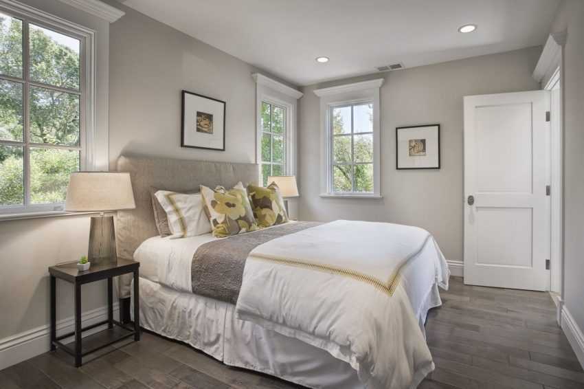 Цвет пола в серой спальне может быть как темным, так и светлого цвета. При выборе следует взять за основу площадь помещения. Для маленькой комнаты имеет смысл подобрать светлый оттенок для оформления.
