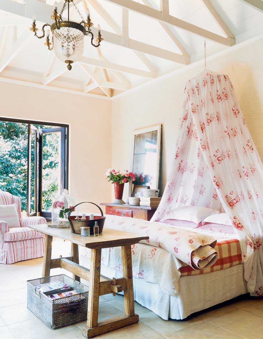 Спальную комнату обставляют мебелью, которая сделана из натурального дерева, окрашивают её в белоснежный цвет таким образом, чтобы текстура просвечивалась через краску.