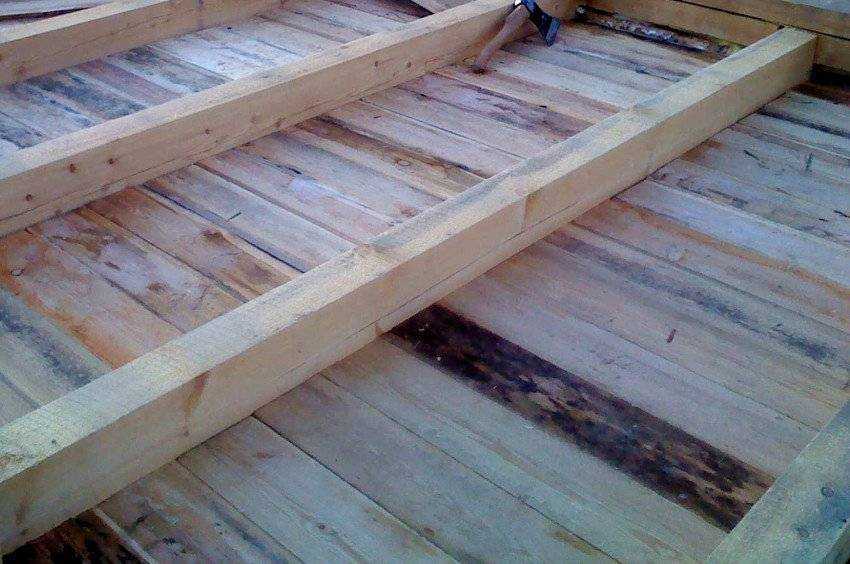Перед монтажом деревянные элементы покрывают специальными защитными пропитками. Это убережет их от проникновения влаги и появления грибка. В первую очередь, это касается чернового слоя досок и лаг.