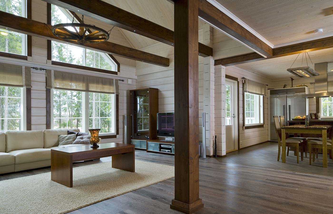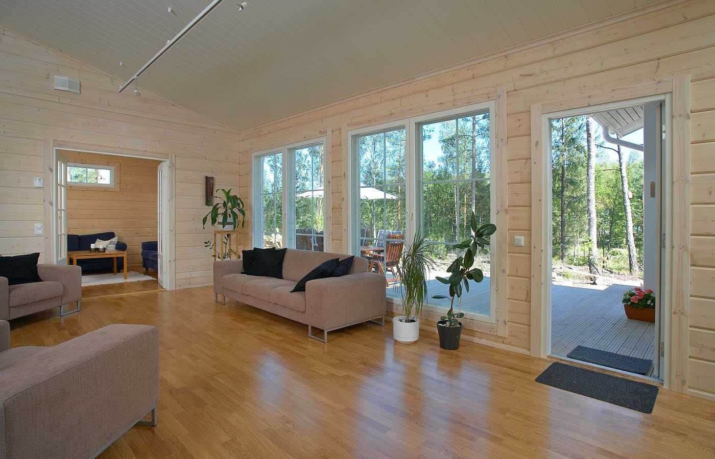 Дополняют интерьер двери и окна из калиброванного или оцилиндрованного бруса, которые являются органичным дополнением для бревенчатого дома. Завершает декор интерьера правильно подобранный текстиль. Выбор штор – это последний этап в создании основы вашего будущего интерьера. Для загородного дома чаще всего подбирают плотные занавески, которые и формируют интерьер, и защищают жителей от солнечного света.