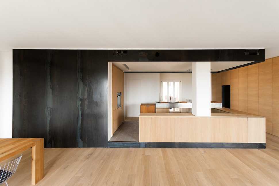 Гладкие поверхности, сделанные из дерева, отлично гармонируют с минимализмом обстановки. Но, такое решение не всегда можно вписать стандартную квартиру – нужно очень много места, и площадей обычно не хватает.