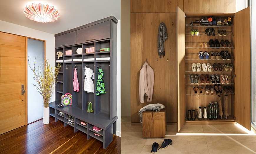 Систему хранения обуви можно интегрировать в нишу стены. Некоторые модели шкафов-купе предусматривают наличие выдвижной секции, где принято оставлять такой предмет гардероба.