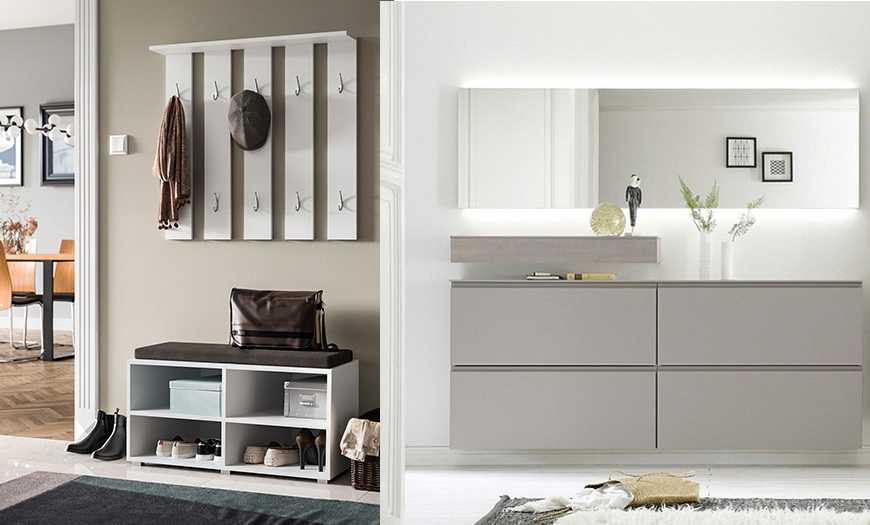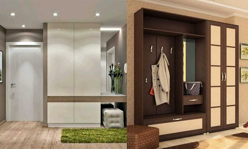 Узкая тумба подойдет для встроенной прихожей размерами 2 на 2 м. Этот функциональный элемент позволяет грамотно скрыть обувь и другие вещи. Прямые полки менее вместительны.