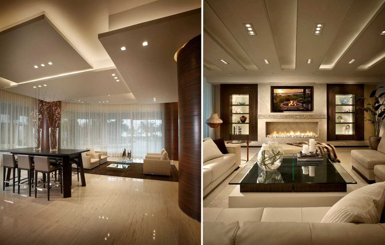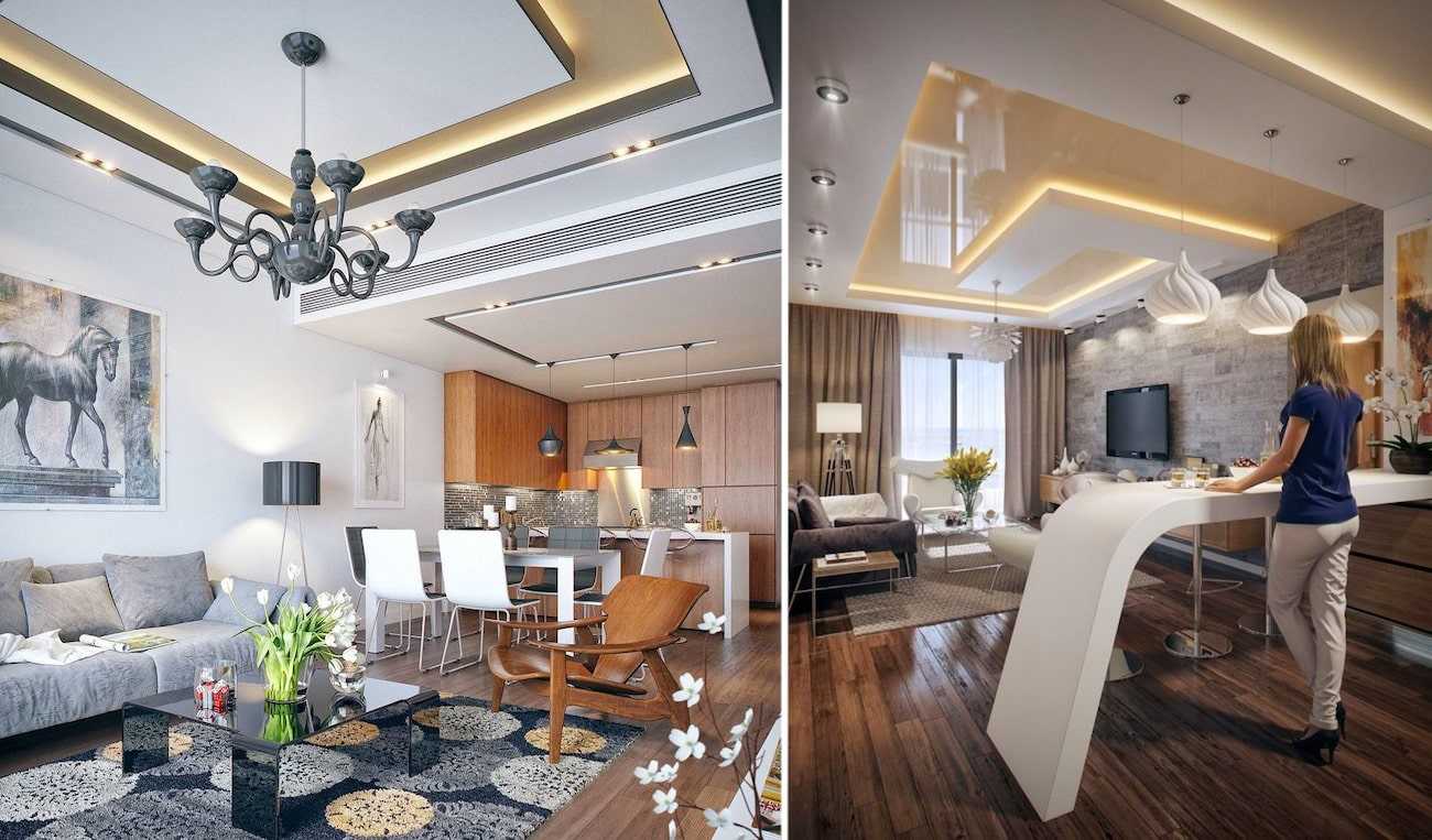 Еще одна современная тенденция — это зонирование помещений при помощи многоуровневых подвесных потолочных конструкций. В идеале визуальные границы повторяются в решении полового покрытия.