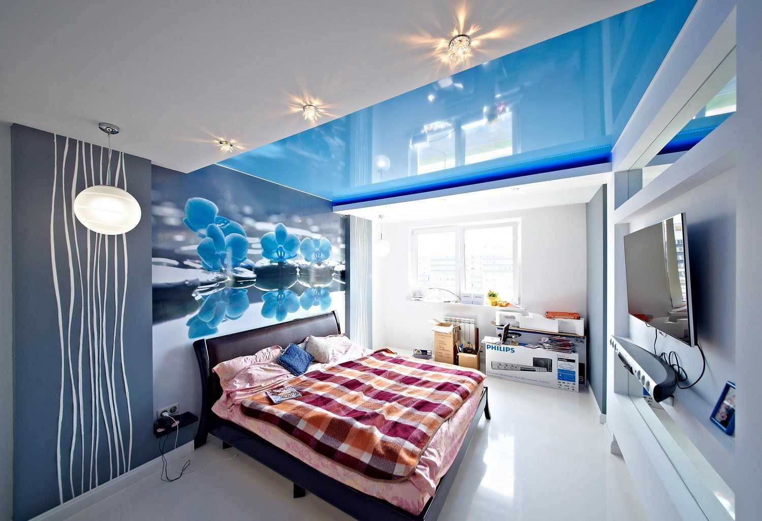 Глянцевый голубой натяжной потолок – отличное решение для низких и небольших помещений