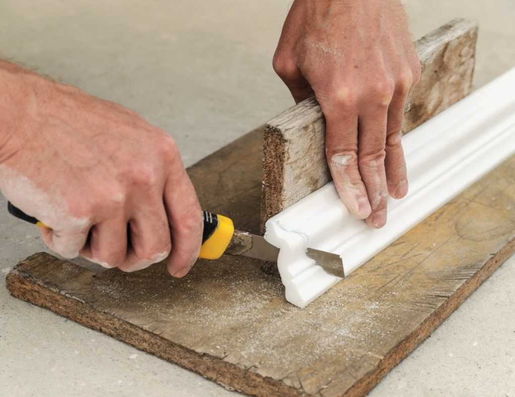 - Для обрезки потолочного плинтуса воспользуйтесь ножом или ножовкой, зависимо от материала, из которого он изготовлен.