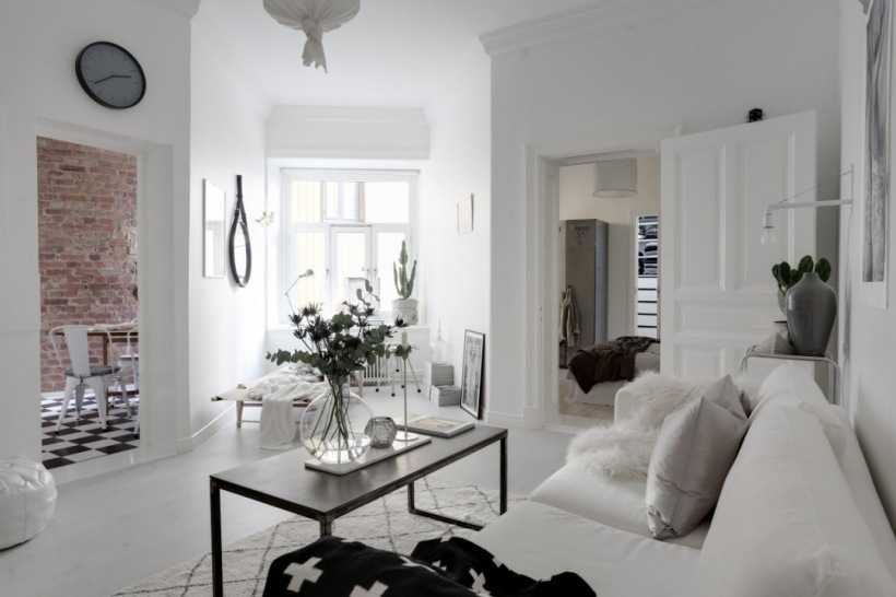 В скандинавских интерьерах хорошо смотрится мебель с матово-белой отделкой или имитацией беленой древесины. Вы можете установить ее напротив белой или черной стены — в обоих случаях она будет хорошо выглядеть. Однако, если в квартире преобладает белый цвет, стоит выбрать мебель с контрастными элементами — например, с черными ручками и темным верхом.