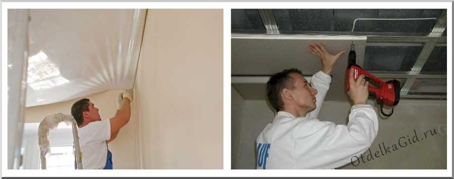Несложные гипсокартонные конструкции можно смонтировать своими руками, однако на это уходит много времени, для обустройства натяжного потолка нужны профессионалы, но работы выполняются в течение дня