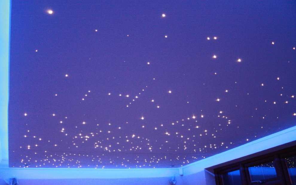 Есть несколько способов обустройства такого потолка, но, в большинстве своем, они подразумевают очень сложные и дорогостоящие работы. Наиболее распространенный из таких сложных способов – установка специальной системы из оптического волокна и проектора.