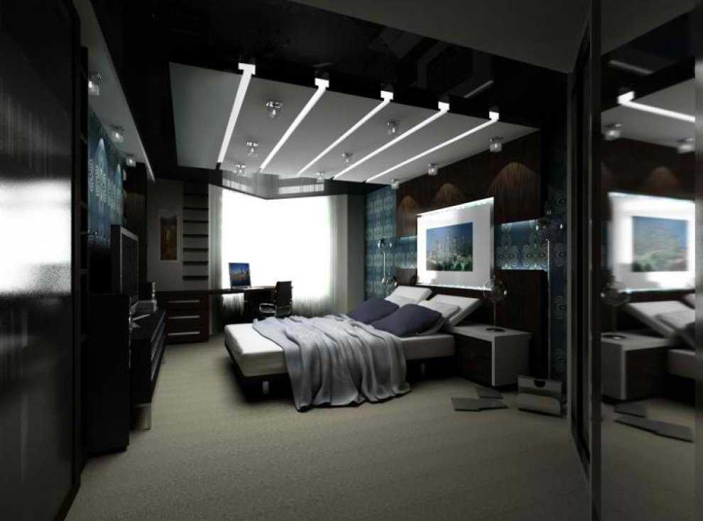 Еще одна оригинальная идея освещения темного натяжного потолка. Этот вариант наиболее подойдет подросткам. На темном фоне натяжного потолка в соответствии с зонированием встроены геометрические фигуры, изготовленные из светодиодных лент, которые находятся в специальных трубочках-профилях. Эти необычные светящиеся фигуры могут играть роль светильников, которые будут включаться как отдельные элементы или все вместе. Возможен вариант усиления и уменьшения яркости света.