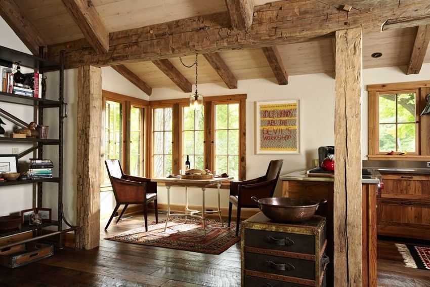 Первозданный вид потолка не только пытаются сохранить, но и качественно воспользоваться всеми преимуществами, которые несут в себе балки, брусья и срубы. Если изучить оригинальные деревянные интерьеры через фотографии и видео, можно нарисовать общую концепцию возможного дизайна постройки.
