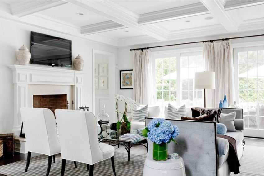 Если в доме перекрытие с видимыми перепадами высоты, то конструкция из гипсокартона решит неприятную проблему. С помощью ГКЛ удастся добиться ровного потолка, а для окрашивания выберите любой оттенок.