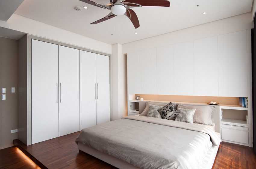 Есть еще один отличный способ обустроить стену за кроватью. На стене может быть встроен шкаф, желательно минималистичный. Вы получите дополнительное украшение и много места для хранения. Высокие шкафы вокруг кровати отлично подойдут для маленькой спальни — они освободят пространство за счет устранения шкафа для гардероба.