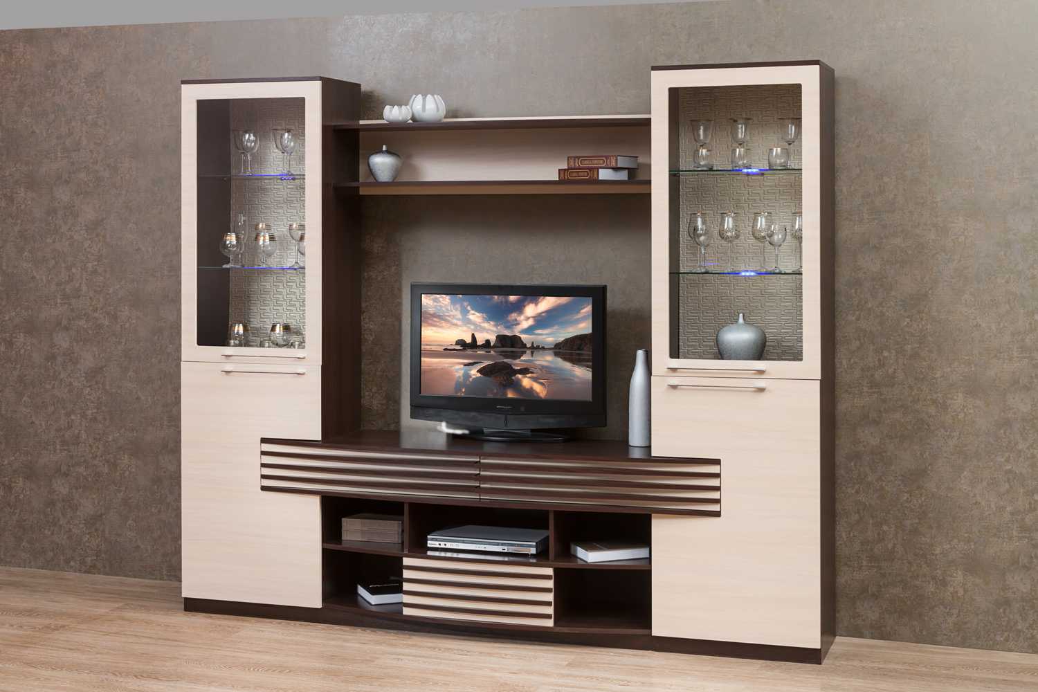 Общая стилистика гостиной должна учитываться при выборе стенки под телевизор в зал. Если это эко-стиль, никак классических цветов не избежать, но можно выбрать стенку под телевизор с нестандартной формой полок, из древесного массива.