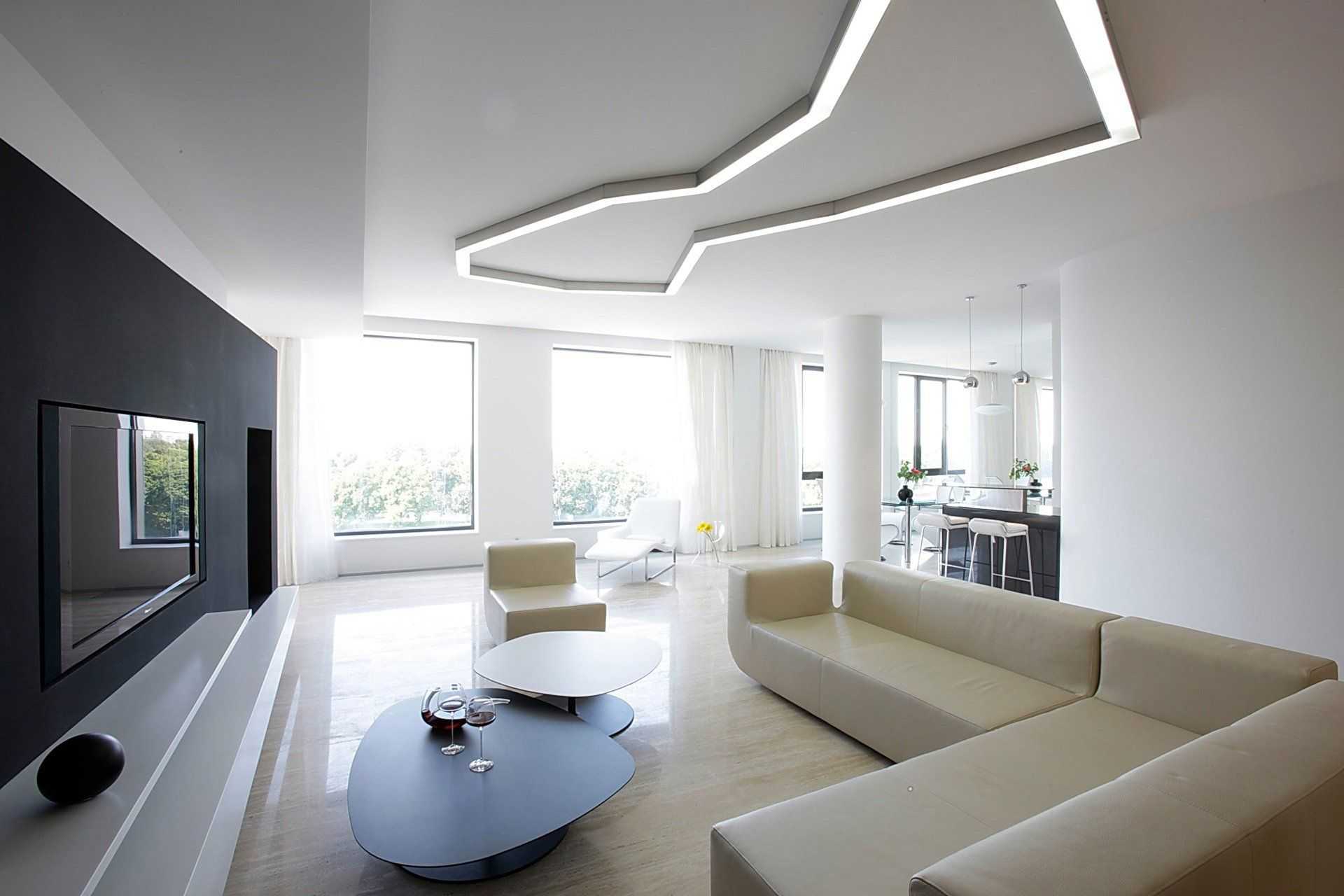 При создании модерна в интерьере квартиры, двери стоит заменить изящными арками. Если есть такая возможность, то оконные проемы тоже лучше закруглить сверху. В таких интерьерах приветствуется монтаж многоуровневых натяжных потолков с подсветкой по периметру или с точечными светильниками.