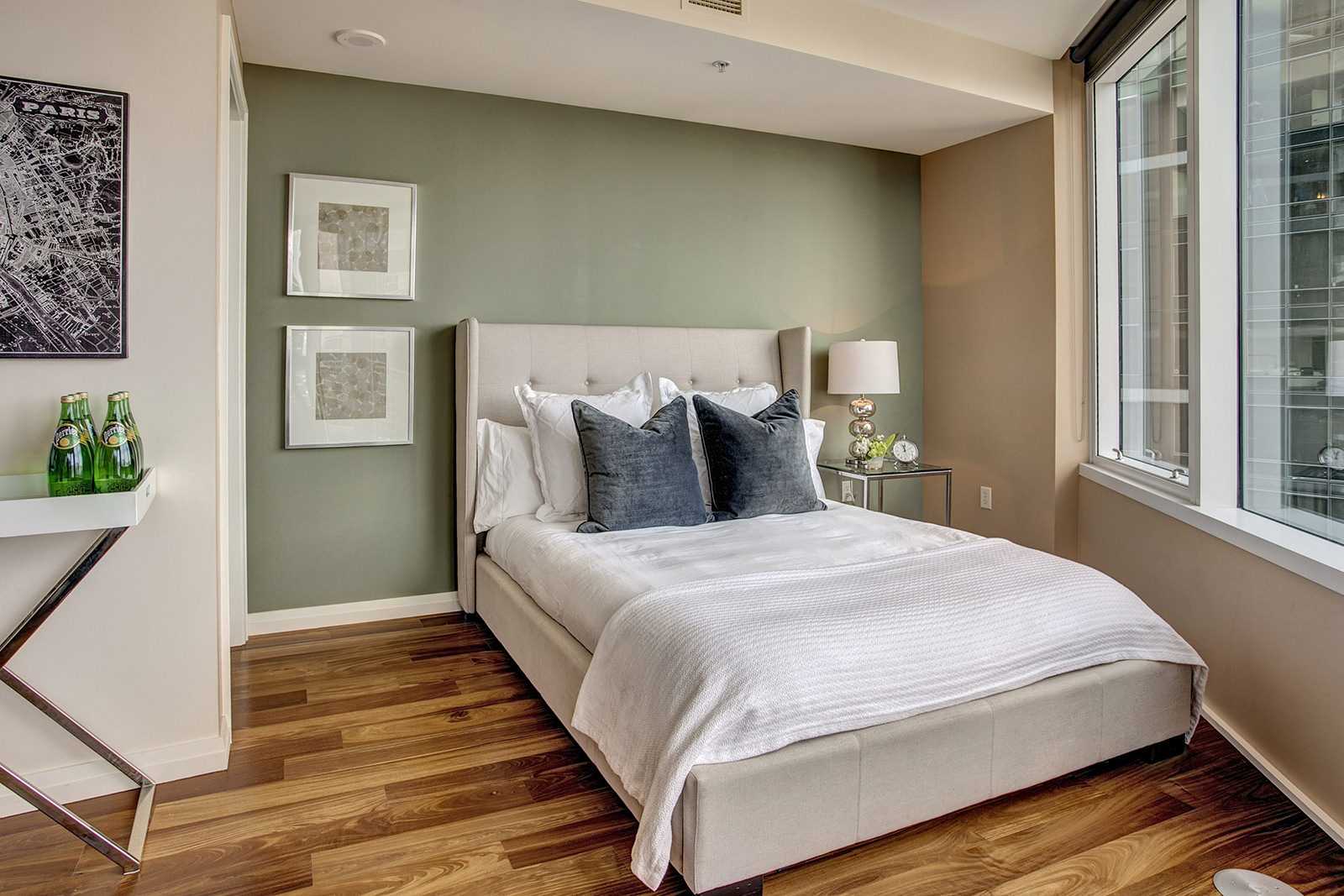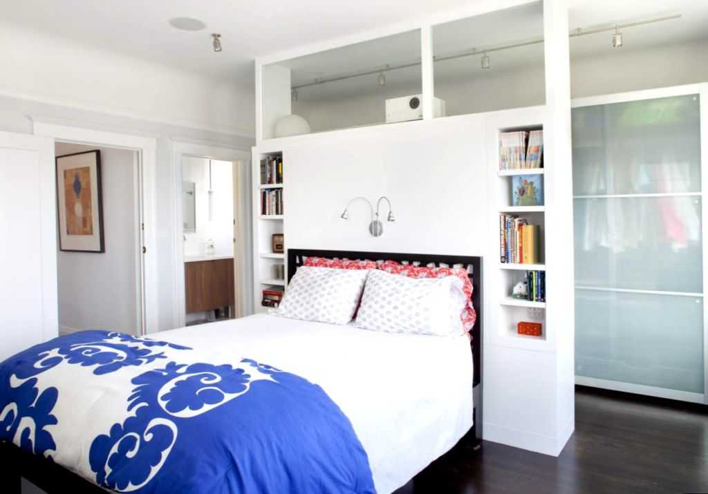 В тесном помещении актуально, если модель помещает гардероб, предметы быта и другие вещи. Поэтому здесь уместна вместительная мебель. Чтобы зрительно увеличить пространство, фасады выполняются в светлых оттенках и декорируются зеркалами. Чаще всего мебель ставят к одной из боковых стенок, по возможности торцом к окнам.