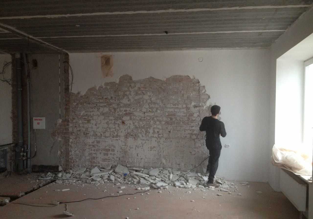 Облегчить процесс избавления от штукатурки позволяет смесь литра воды и 2 столовых ложек крахмала. Полученным составом смачивают нужную область. Начинают отбивать штукатурку молотком или шпателем. В сложных случаях допустимо использовать перфоратор или болгарку. Остатки штукатурки убирают металлической щеткой. В завершении процесса рабочую область протирают влажной тряпкой.