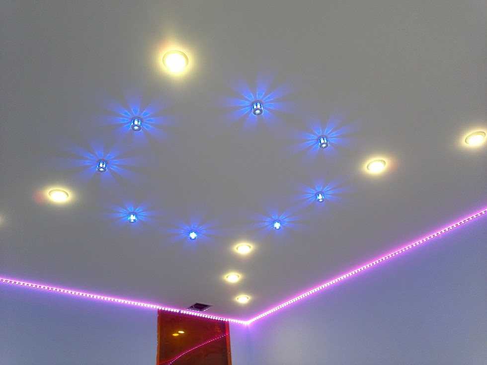 Светодиоды устанавливаются в маленькие плафоны, которые будут вмонтированы в готовый потолок. Лампочки устанавливаются по нескольку штук, одна, например, светит вниз, несколько других создают «лучики» на поверхности потолка. |