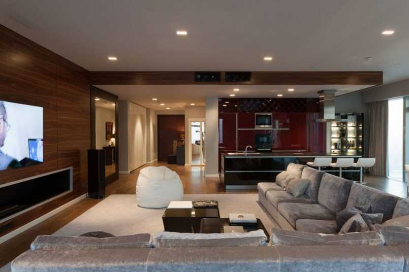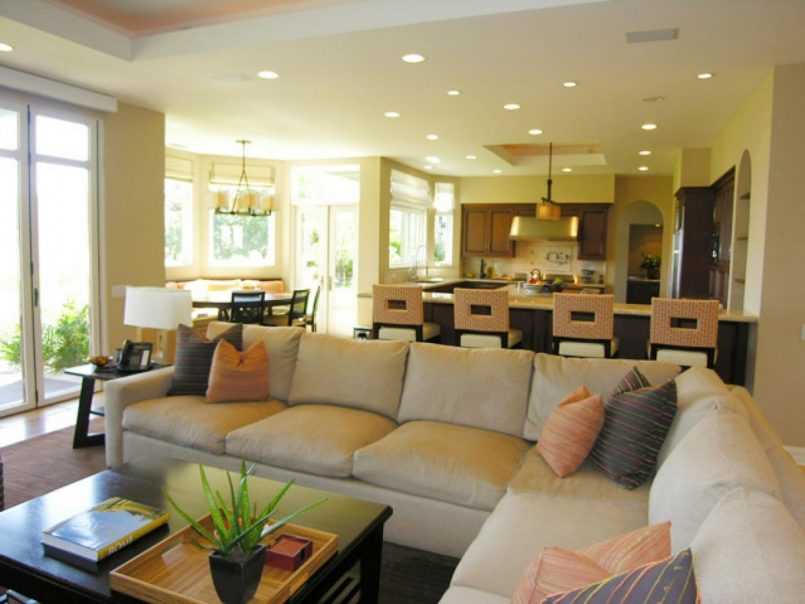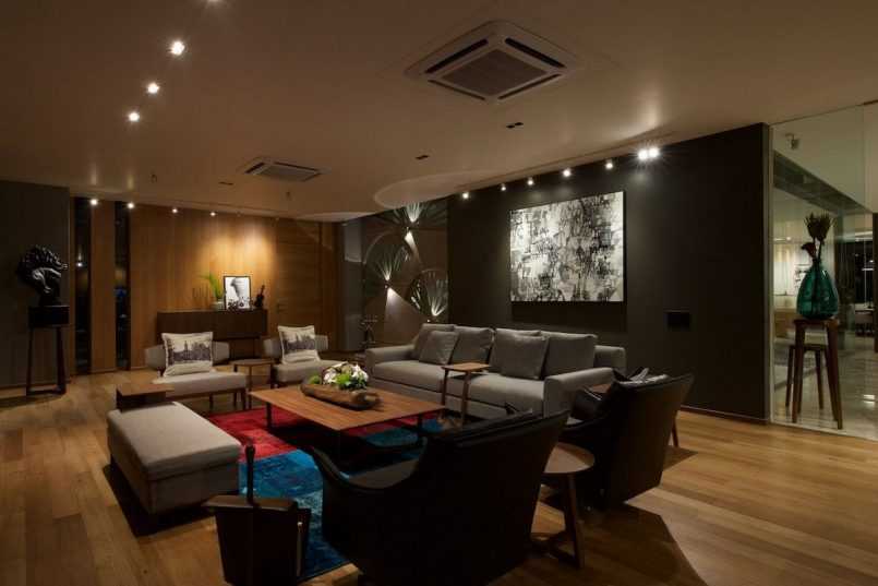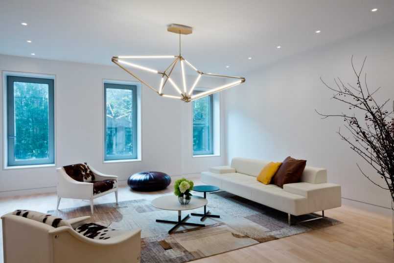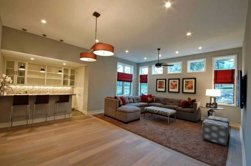 Одним из решений при оформлении гостиной является применение комбинированного освещения. Точечные светильники равномерно располагаются относительно основного источника света или по периметру, здесь нужно учесть возможность регулирования мощности.