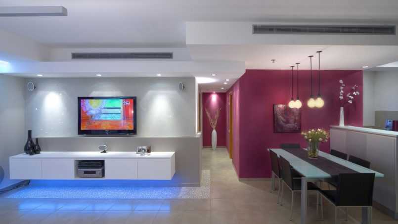 Кстати, подсветка потолка не обязательно должна быть белой. Она может быть и одноцветной декоративной, и разноцветной RGB, то есть переливаться красным, зеленым, синим и другими оттенками. Цветная подсветка, если она подходит по цвету лампочек к стилю интерьера и общему виду комнаты, будет очень хорошо смотреться по периметру комнаты как при включенном основном свете, так и в темноте.