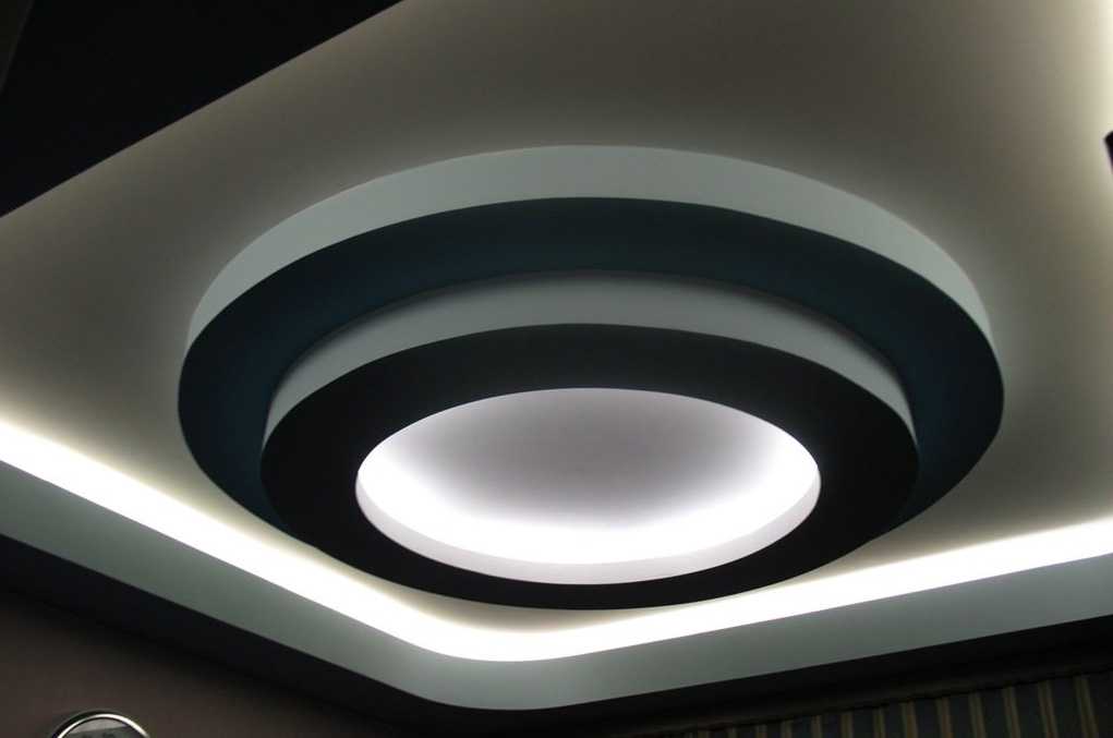 Наряду со светодиодными полосами широкую популярность набрали светодиодные трубки. Они дают возможность добиться создания необычной островной подсветки. Также очень распространено комбинированное освещение: в этом случае центральная зона основания оснащается люстрой, а ее края – светодиодными приборами. Чаще всего таким способом оформляются многоярусные конструкции, что дает возможность получить причудливые световые комбинации.