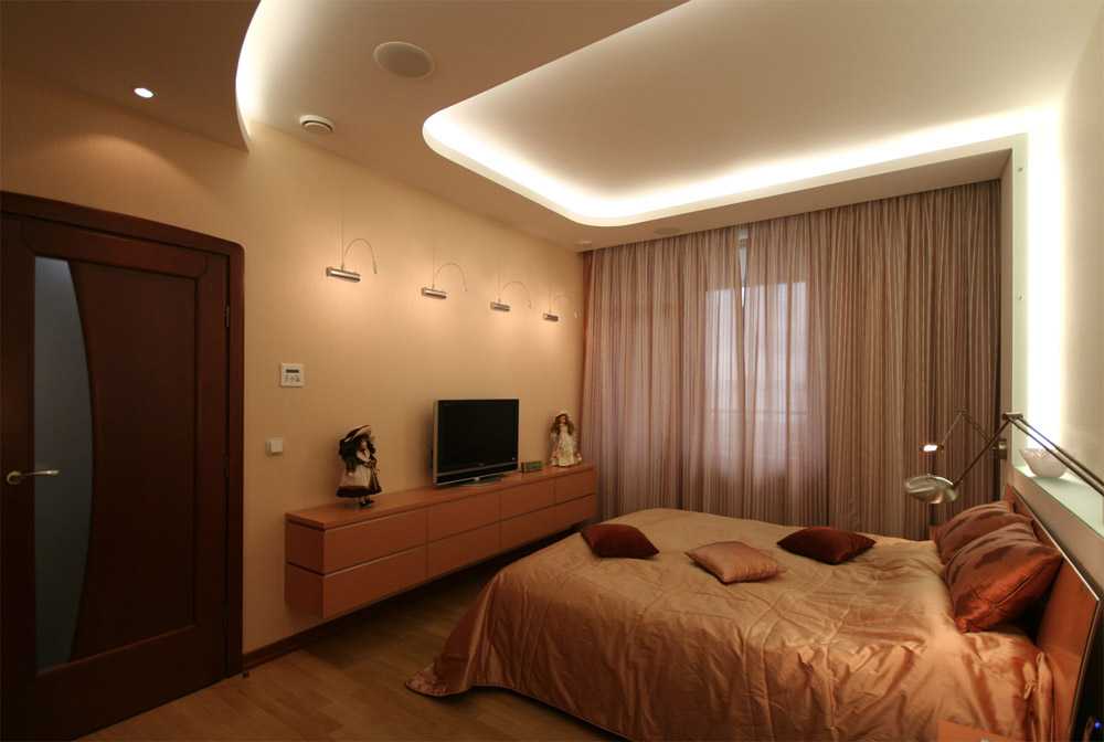 - Ниша. Как хорошо видно на фото, гипсовые потолки с подсветкой в нише создают впечатление, что источник света «висит» в воздухе. Обычно ниши делают в конструкциях специально, чтобы оформить их с помощью LED-ламп. Когда светодиоды поворачивают вверх, они будут излучать нежный, рассеянный свет. Если применить боковую подсветку, свет будет направленным, идущим вдоль «невесомой» потолочной системы.