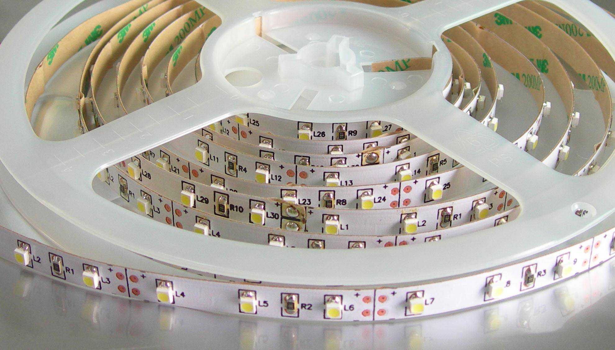 На гибкую ленту наносят 0,2 мм диэлектрика, на одинаковом расстоянии крепят контактные площадки со светодиодами, монтируют резисторы, ограничивающие потребляемую энергию – это и есть светодиодная подсветка.