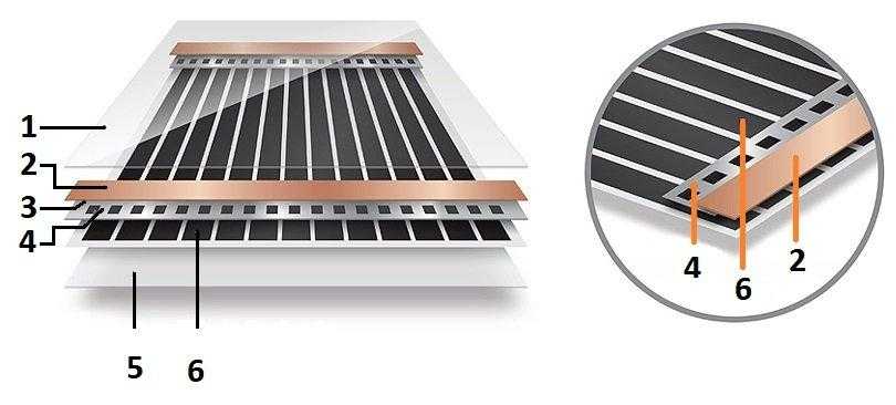 На схеме показан инфракрасный пленочный пол с карбоновыми полосами, медной и серебряной подложкой. также существуют варианты с: